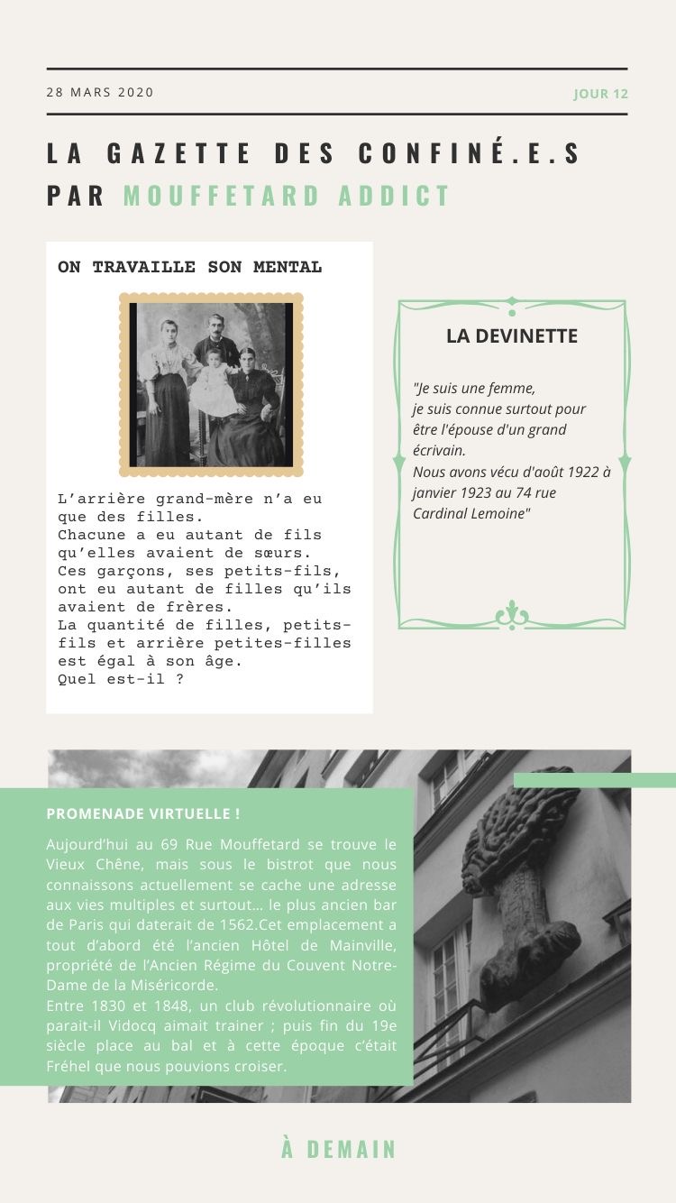 Dans cette Gazette 100% Mouffetard je propose donc jeux, pause litterature ou cinéma, ancedote, etc… du contenu qui concernait integralement le 5eme arrondissemenft !
