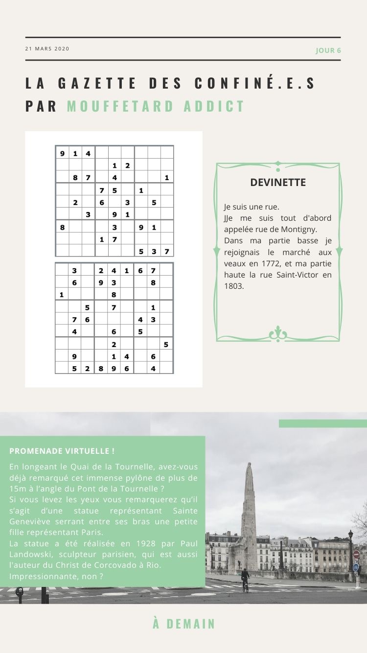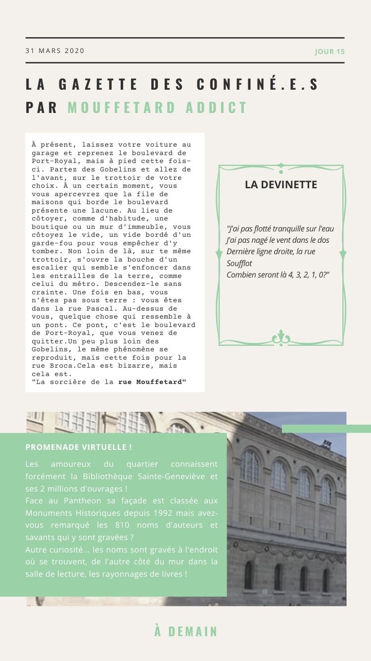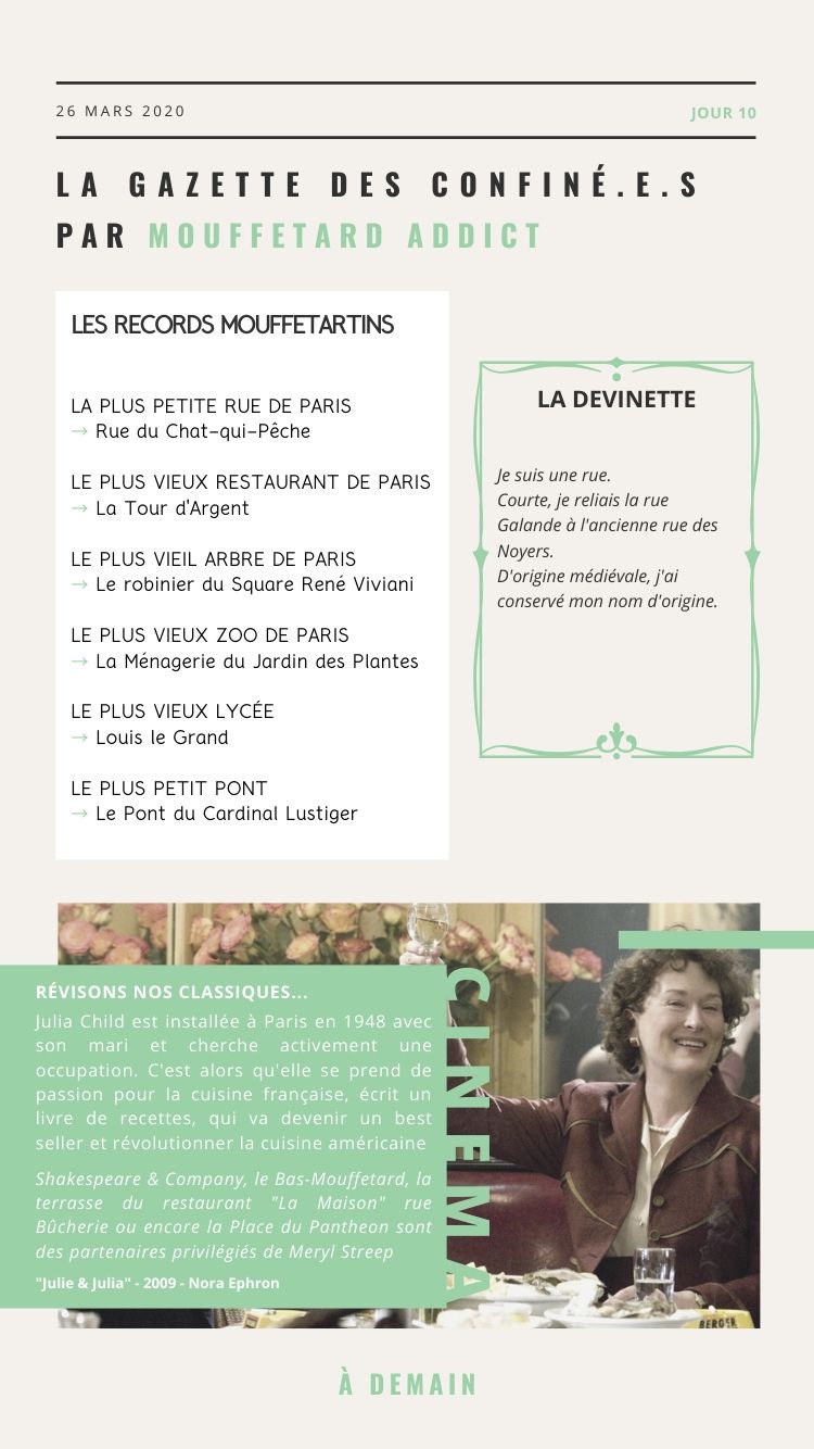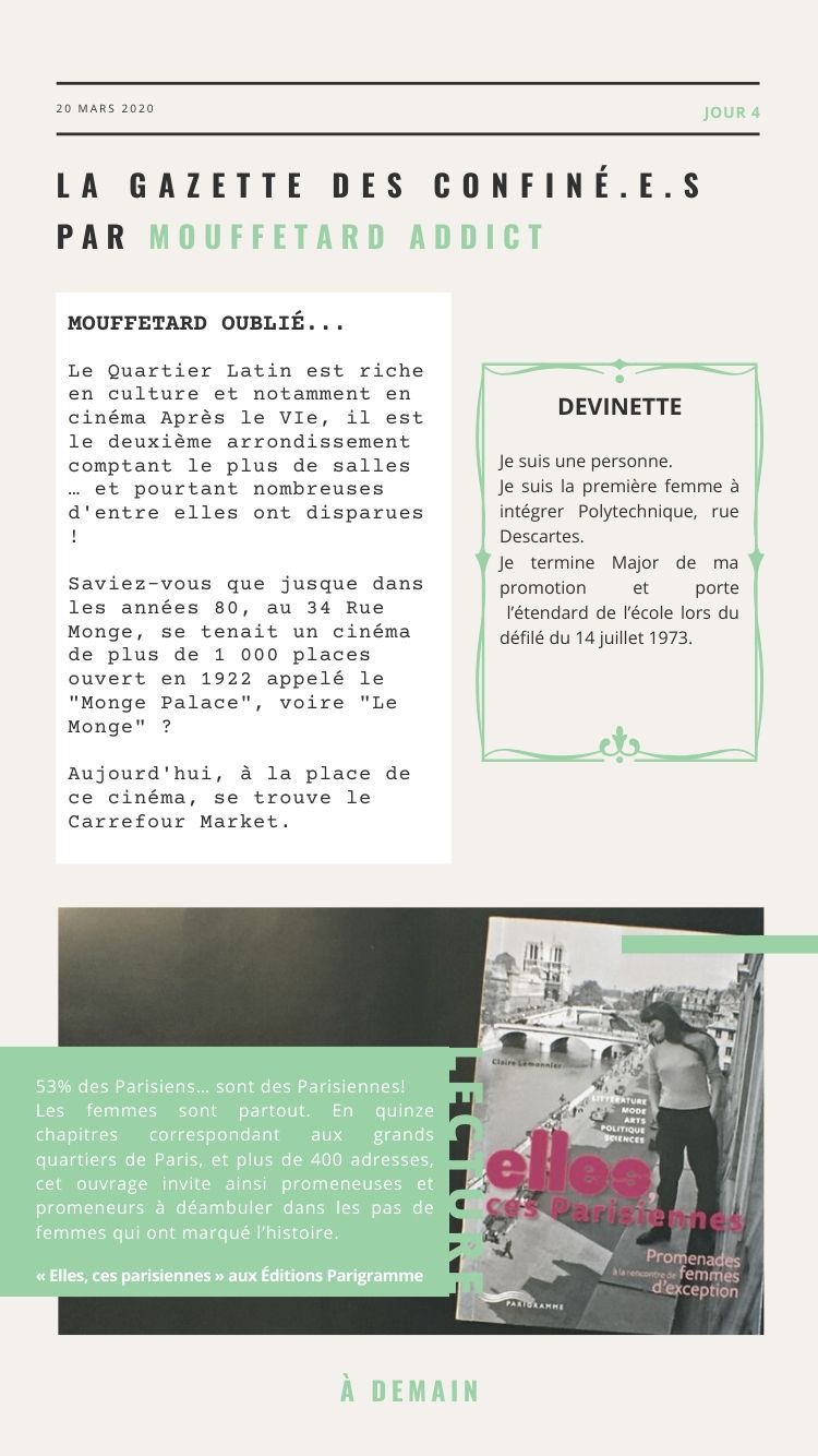 Outre les dossiers « spécial confinement » (activités en famille, boutiques ouvertes, restaurants qui proposent le click&collect, films 100% quartier latin…), j’ai proposé chaque matin à 11h La Gazette en story.