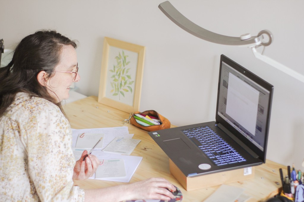 A côté, je crée ma papeterie 100% artisanale donc je crée les visuels, j’imprime, je coupe, je monte les blocs, les carnets, etc… Et puis récemment, j’ai lancé une nouvelle offre autour de l’organisation pour créer des supports d’organisation sur mesure (donc des produits de papeterie sur mesure ou des espaces Notion sur mesure). A côté de tout ça, j’écris aussi et je filme et monte des vidéos pour ma chaine Youtube. Et puis comme tout entrepreneur, je m’occupe de toutes les casquettes qui me permettent de développer mon entreprise : les photos, la communication, la gestion de mon site internet, l’administratif, la recherche de fournisseurs, etc…