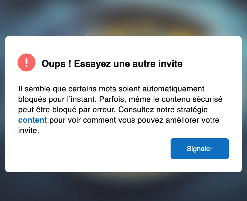 Demande 1 : « je veux une photo de personnes handicapées, souriantes, bienveillantes, représentants tous les handicaps : aveugle, amputée, bras atrofiés, trisomiques, prothèse de jambe, Parkison, cancer sans cheveux, personne en fauteuil » = RIEN